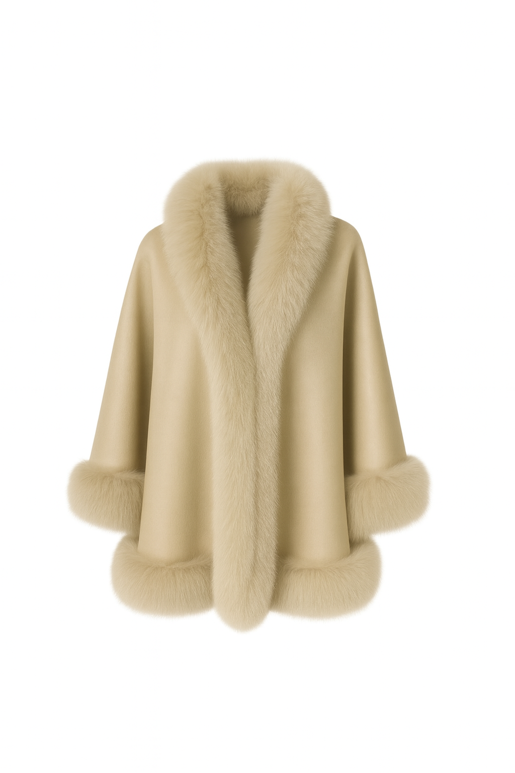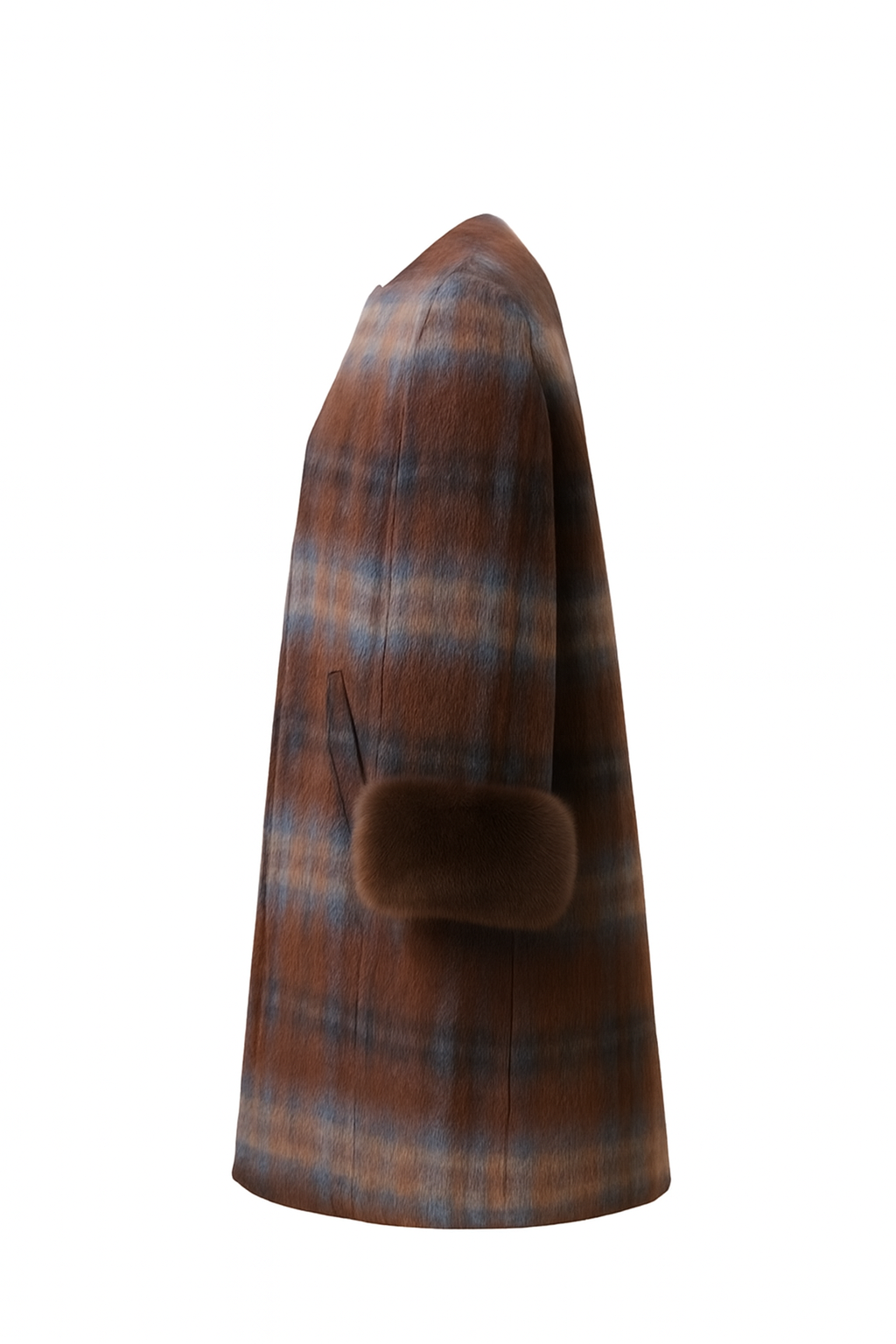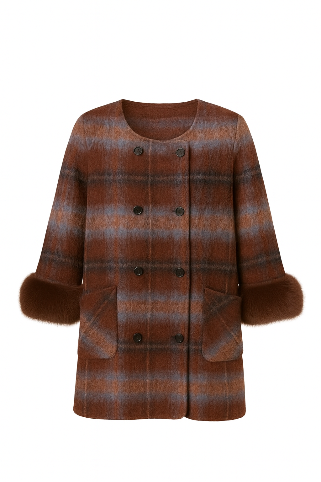 Relaxed sophistication meets timeless luxury. The Imogen Jacket is tailored from a soft checked wool blend and finished with plush brown fox fur cuffs — a subtle statement of texture and warmth.