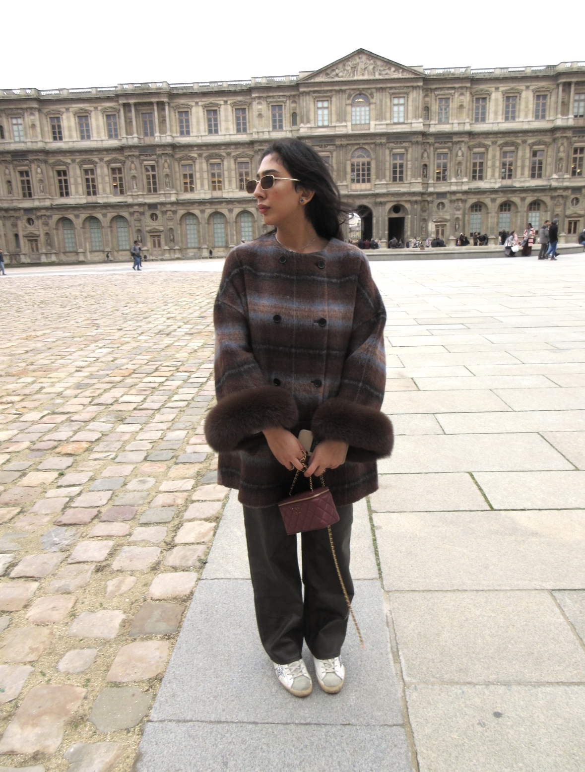 A chic blend of classic plaid tailoring and modern fur-trimmed elegance